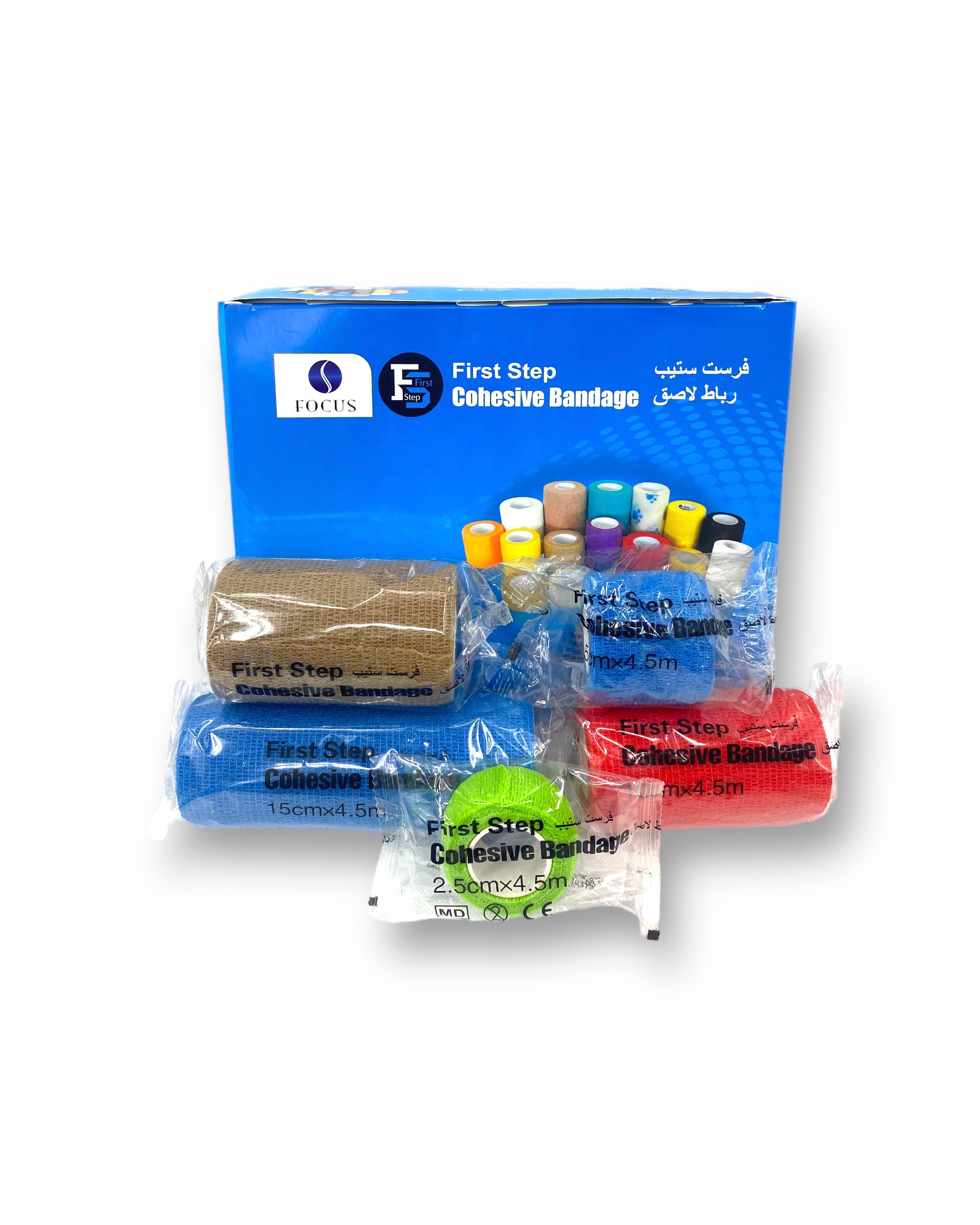 ضمادات فرست ستيب المتماسكة مُحسَّنة، ضمادات سهلة الشاي تلتصق بنفسها وليس الجلد أو الشعر أو الملابس. انها مناسبة للمفاصل والأجزاء الأخرى التي يصعب ارتدائها وتستخدم على نطاق واسع في المجالات الطبية والرياضية والبيطرية. فهي ناعمة ومريحة وذات نفاذية هواء جيدة ومقاومة للماء ولا تسقط عند ملامستها للعرق. هذه الضمادات ملفوفة بشكل فردي وهي مثالية للعلاج والوقاية من إصابات الكاحل والمعصم والركبة والكتف.
